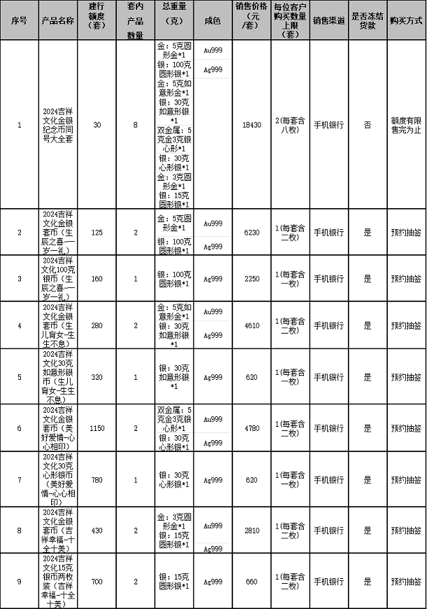 根据中国人民银行贵金属纪念币发行安排,“2024吉祥文化金银纪念币”已于近日公告发行,我行根据安排将参与本产品的销售工作。现将有关事项公告如下: