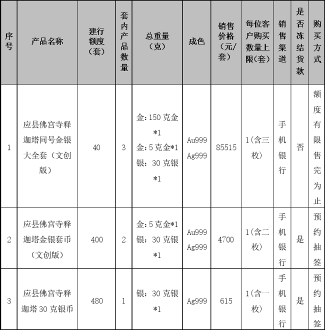 1.应有关要求,本次贵金属纪念币面向实名客户销售,应县佛宫寺释迦塔同号金银大全套(文创版)不限制客户星级,产品额度有限,售完即止。其余各规格采用“预约抽签”方式确定可购买的客户。本产品对应的每位客户购买数量上限等请见本公告第一条中“具体产品信息”内容。