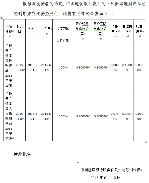 中国建设银行苏州分行保本理财产品2015年第19期和37期理财产品兑付公告