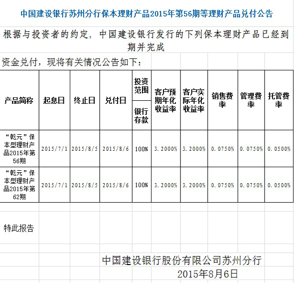 中国建设银行苏州分行保本理财产品2015年第56期等理财产品兑付公告