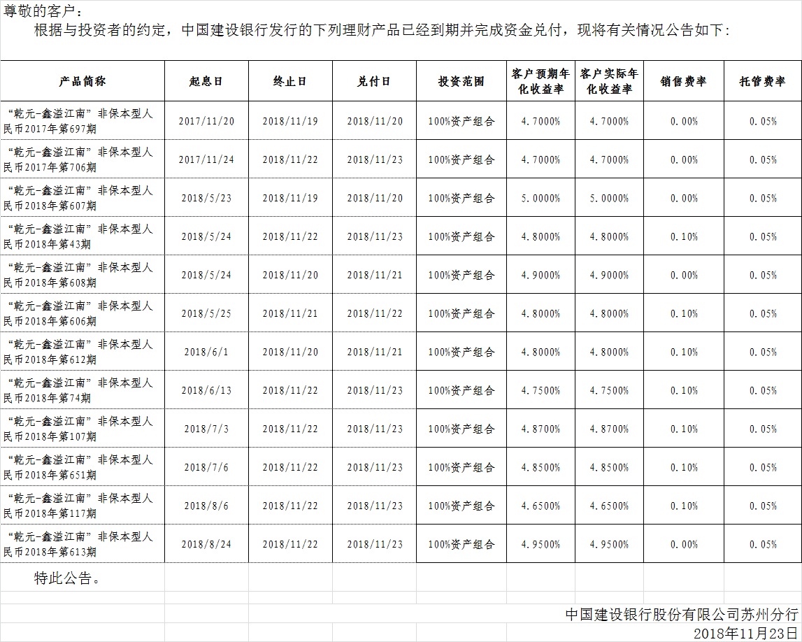 中国建设银行理财产品终止及清算公告