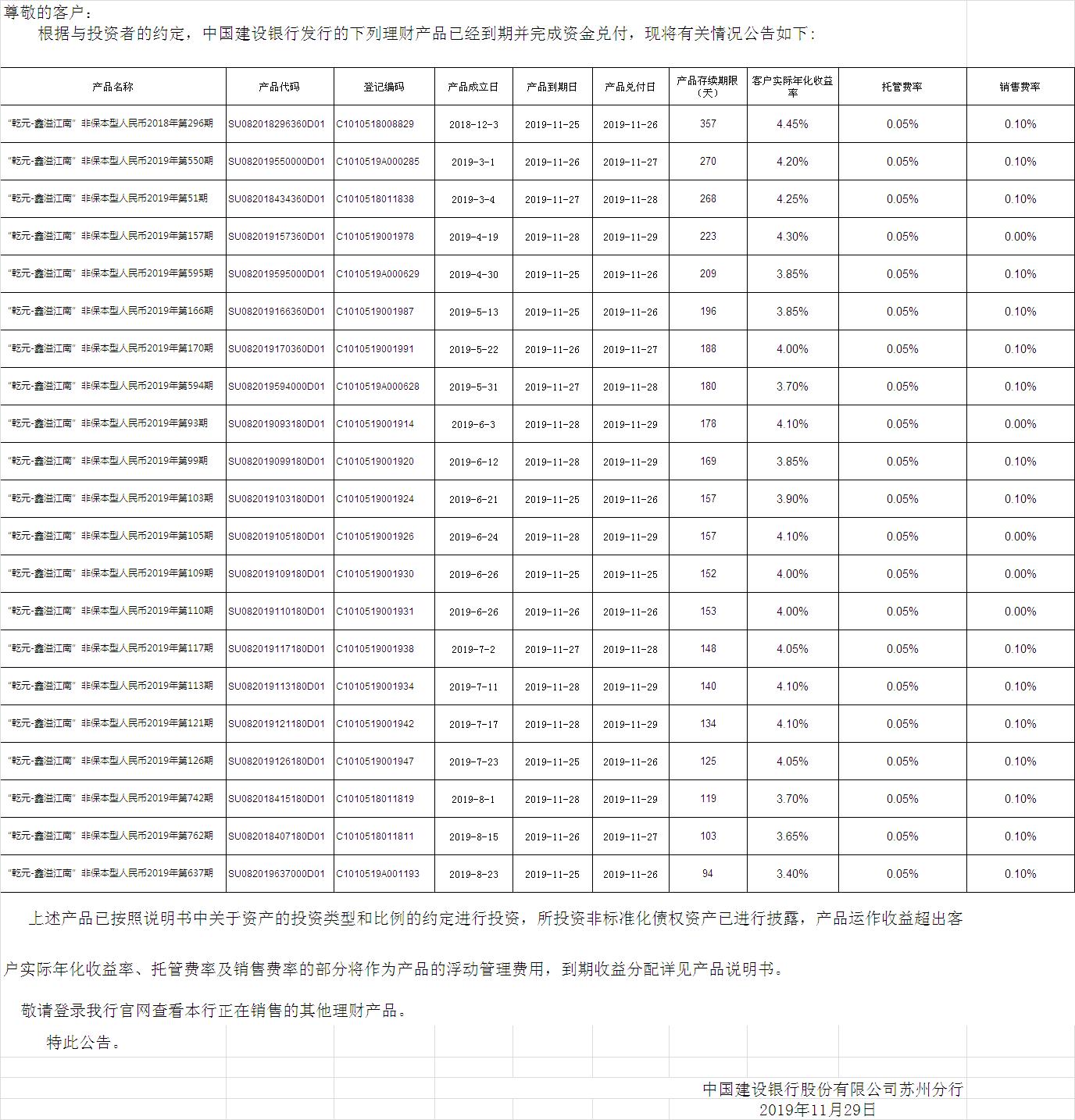 中国建设银行理财产品终止及清算公告