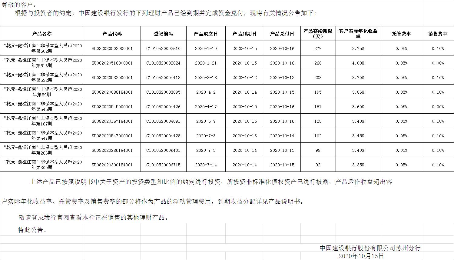 中国建设银行理财产品终止及清算公告